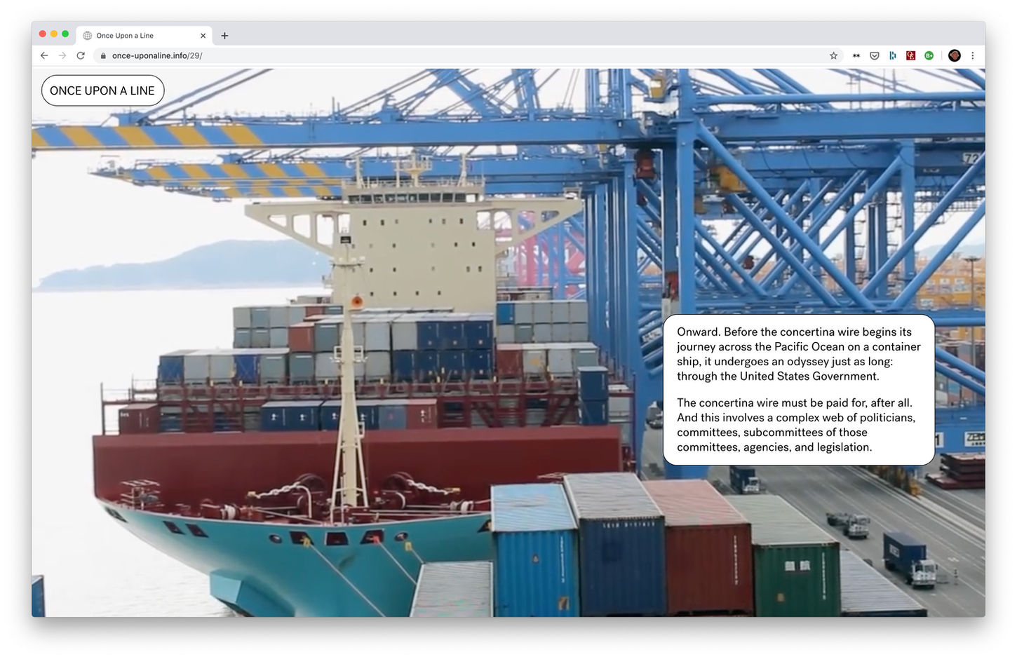 What happens when we see a border as not one line, but many? Extending up and down and out; crisscrossing, colliding, burrowing. Once Upon a Line is a digital essay that traces the material life of concertina wire and unpacks its social, political, economic, ecological, and technological histories as they converge on the international border between the United States and Mexico. Through this multimedia narrative, our ambition is to propose a new and grounded way of revealing the material complexity of borders, and to demonstrate the extensive global collaboration required to keep us apart.